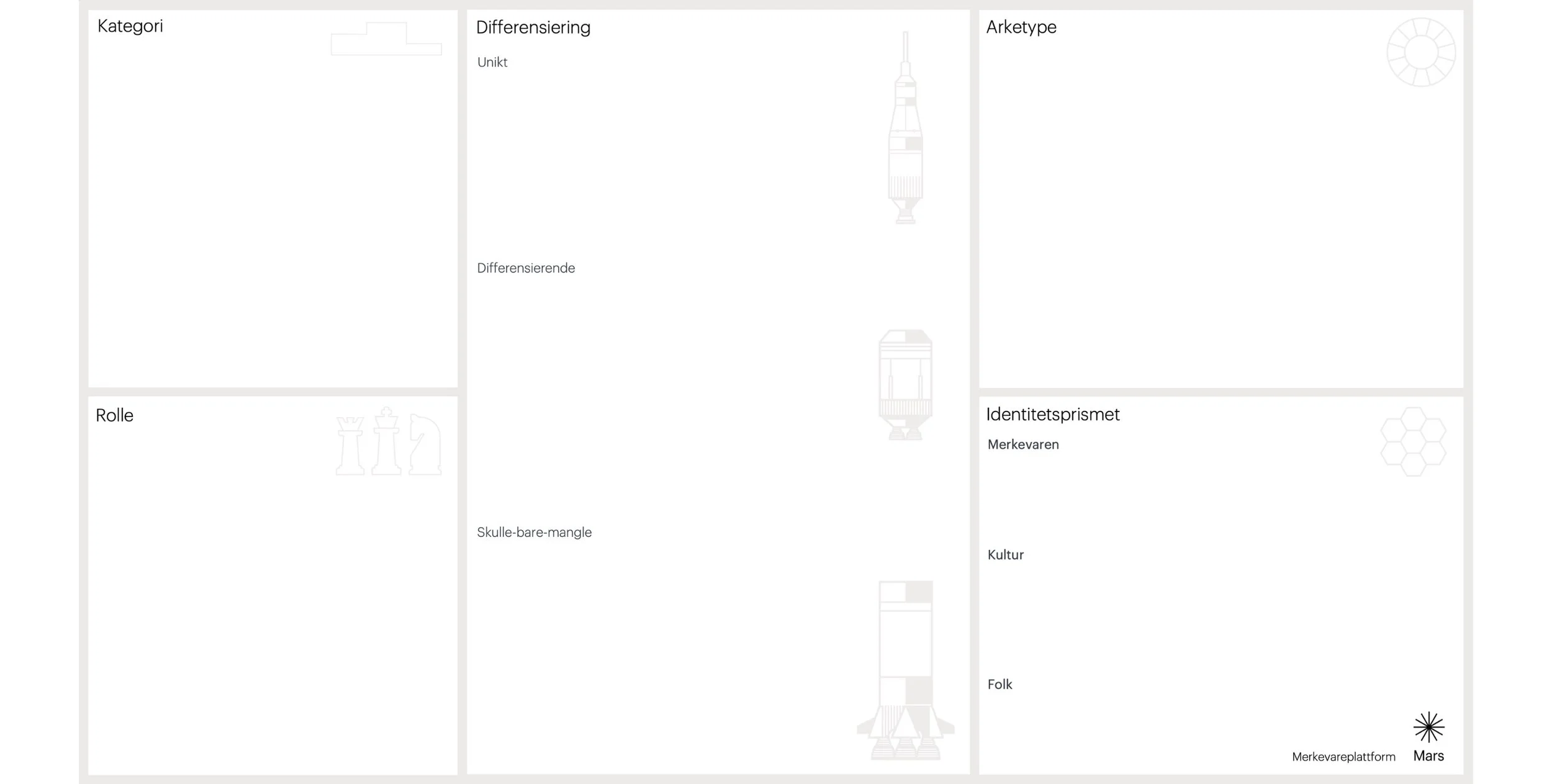 Når vi prototyper, så bruker vi Mars-metodens verktøykasse for å rydde opp, så konkurransearenaen og merkevarens plass på denne, fremstår tydeligere. Det er viktig at den er tydelig for alle som skal bygge merkevaren, og alle folkene merkevaren er til for.